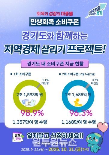 한편 경기도의 지난 1차 소비쿠폰의 지급률은 98.9%로 1,357만여 명이 소비쿠폰 2조 1,593억 원을 수령한 바 있으며, 26일 현재 1차와 2차를 거쳐 지급된 소비쿠폰(약 3조 3,275억 원)의 91.5%가 사용된 것으로 나타났다.