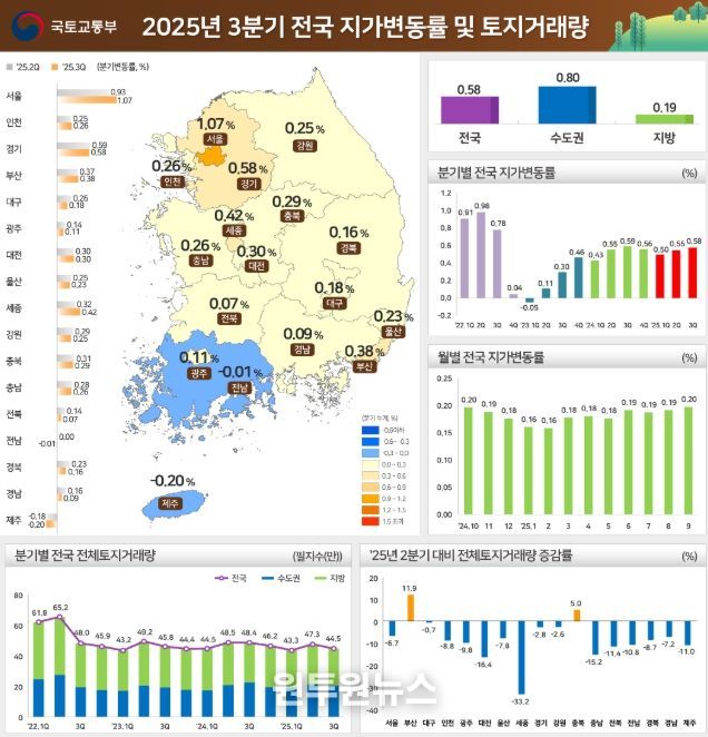 (원투원뉴스) 국토교통부와 한국부동산원(원장 손태락)은 '25년 3분기 지가변동률 및 토지거래량을 발표했다.