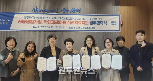 시는 지난 27일 시청 컨퍼런스룸에서 사회복지법인 빛나라, 구성심리상담센터 광명점, 광명시청소년상담복지센터, 서울튼튼소아청소년과의원과 ‘공동생활가정 및 학대피해 아동 심리치료·후원연계·의료지원 관련 업무협약’을 체결했다.