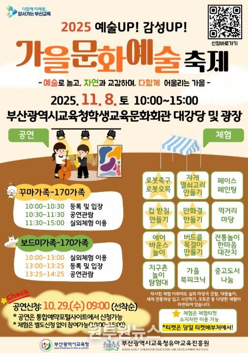공연 관람은 사전 신청제로 진행한다. 10월 29일 오전 9시부터 11월 6일 오후 3시까지 부산시교육청 통합예약포털을 통해 선착순으로 신청하면 된다. 체험활동은 별도 신청 없이 참여할 수 있으며, 일부 체험부스는 당일 현장에서 티켓을 배부받아 참여할 수 있다.