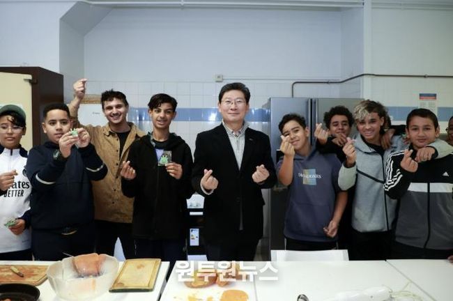 이상일 시장은 호박 케이크를 만드는 프로그램을 듣는 중이던 프랑스 청소년들도 만났다. 한국에 관심이 많은 청소년들이 이 시장을 만나고 싶어한다는 이야기를 듣고 요리실을 방문했다.