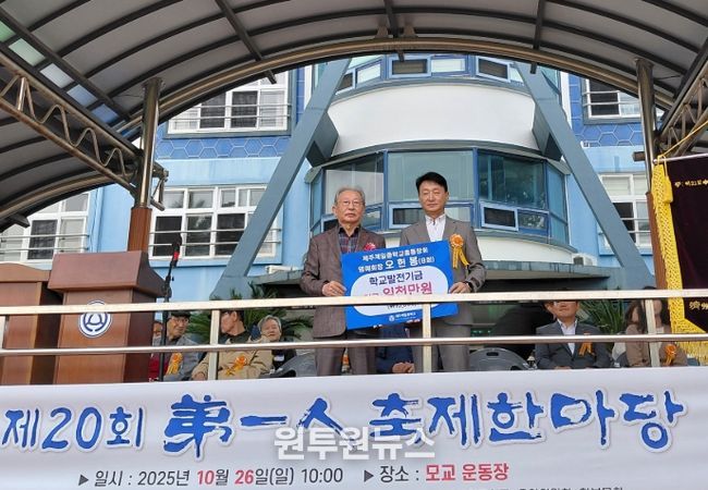 (원투원뉴스) 제주도교육청 제주제일중학교는 26일 열린 제20회 제주제일중학교 총동문회‘제일인(弟一人) 축제 한마당’에서 제8회 졸업생 오헌봉 ㈜유성건설 회장이 학교 발전을 위해 2025년부터 2027년까지 3년간 매년 1천만 원씩, 총 3천만 원의 발전기금을 기탁하기로 하고 첫 해분 1천만 원을 전달했다고 밝혔다.