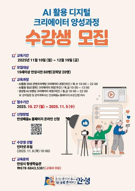 교육은 디지털 콘텐츠 제작 역량을 높이는 데 중점을 두고 ▲AI 활용 SNS 콘텐츠 마케팅 크리에이터과정 ▲AI 활용 영상(영화) 크리에이터과정 ▲생성형 AI 브랜딩 크리에이터 등 3개 과정으로 운영된다. 교육 기간은 11월 10일(월)부터 12월 19일(금)까지이며 과정별 세부일정은 ‘안성 배움e’에서 확인할수 있다. 각 과정별로 20명씩 모집한다.