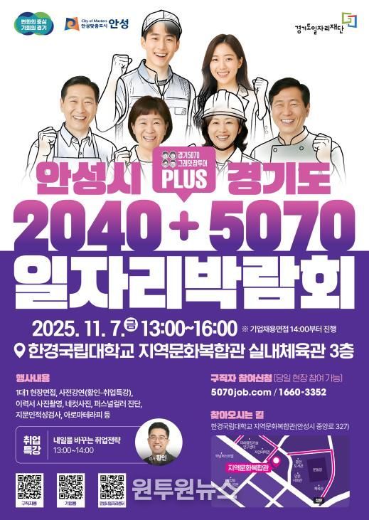 경기도와 안성시가 공동주최하는 이번 안성시2040 · 경기도5070 일자리박람회는 전 세대를 아우르는 채용의 장으로 ㈜농심, 쿠팡물류센터, 다이소, 한살림연합 등 관내 우수기업이 참가하며, △이력서사진촬영 △퍼스널컬러진단 △지문인적성검사 △아로마테라피 등 다양한 부대행사도 함께 진행한다.