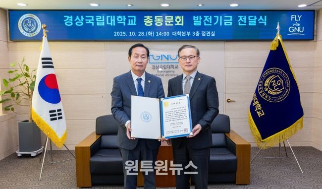 (원투원뉴스) 경상국립대학교 총동문회와 재경총동문회는 10월 28일 모교에 발전기금 1000만 원을 기부했다. 이날 기부한 발전기금은 총동문회에서 500만 원, 재경총동문회에서 500만 원을 출연한 것이다.