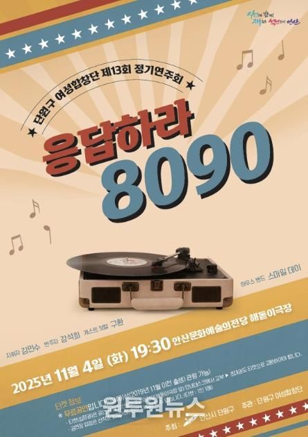 (원투원뉴스) 안산시 단원구는 11월 4일 오후 7시 30분부터 안산문화예술의전당 해돋이극장에서 ‘응답하라, 8090’을 주제로 ‘제13회 정기연주회’를 개최한다고 29일 밝혔다.