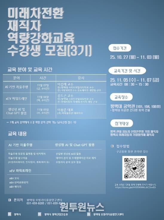 교육 운영기관인 평택대학교는 강사진 구성과 실습환경 및 교육 품질 관리 등 전체 과정을 직접 담당하며, 1ܨ기 교육을 통해 축적된 피드백을 반영해 3기 과정에서는 AI·전기전장 융합 분야 및 생성형 AI 실습을 강화했다.