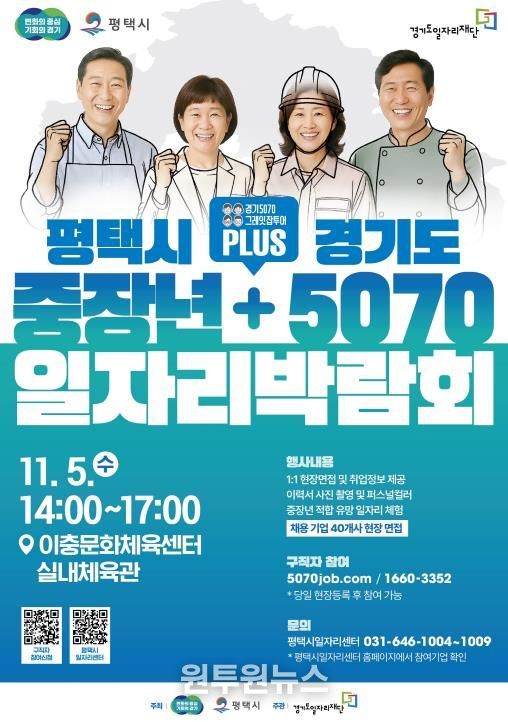 (원투원뉴스) 평택시는 지역 내 우수기업과 구직자 간 만남의 장을 마련하고자 오는 11월 5일 14시부터 17시까지 이충문화체육센터에서 경기도와 합동으로 ‘평택시 중장년 + 경기도 5070 일자리박람회’를 개최한다고 밝혔다.