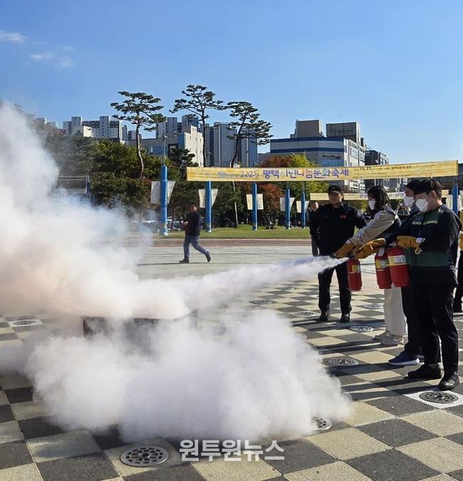 이날 훈련에는 평택시청 상주 직원과 비전119안전센터 소방대원 등 200여 명이 참여했으며, ▲신속한 화재 통보 ▲청사 내 대피 유도 ▲소화전을 이용한 초기 화재 진화 ▲소방차 진출입로 확보 및 차량 통제 ▲모의화재 소화기 진압훈련 등 실제 상황을 가정한 프로그램으로 구성됐다.