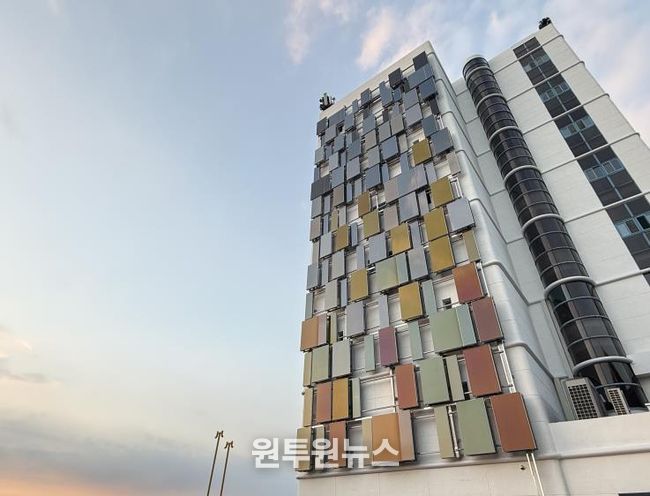 건물 외벽 전면에는 25kw 규모의 컬러 태양광 패널 152개(총면적 240㎡)를 설치해 ESG를 실천했다. 전력 생산과 예술적 조형미를 결합한 설비로, 낮에는 태양광을 흡수해 에너지를 생산하고 밤에는 외벽 조명을 통해 은은한 빛의 연출을 선보이는 공공예술 작품이다.