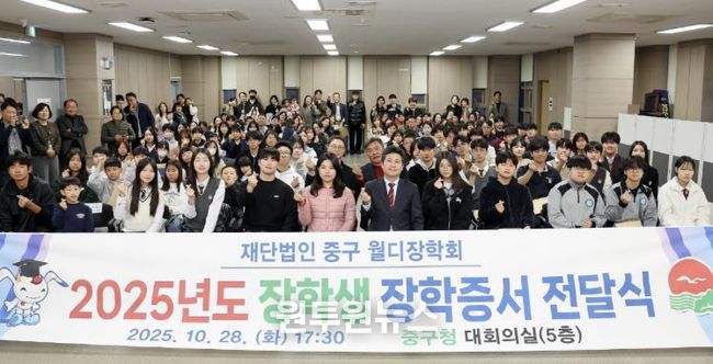 (원투원뉴스) 재단법인 인천 중구 월디장학회는 지난 28~29일 양일간 각각 중구 제2청과 제1청에서 ‘2025년도 장학증서 전달식’을 열고, 총 273명의 학생에게 5억 2,300만 원의 장학금을 지급했다.
