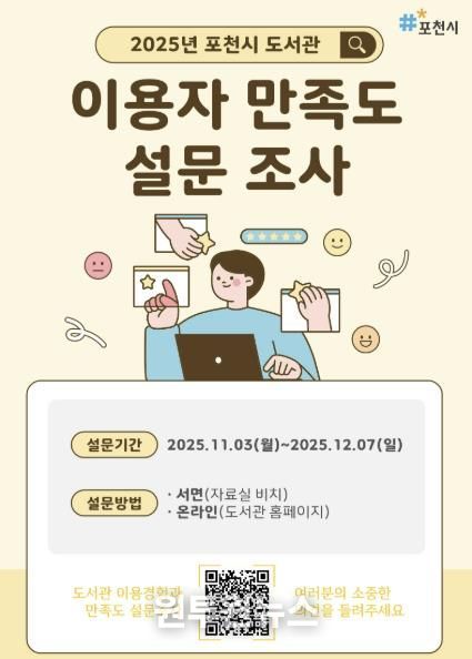 (원투원뉴스) 포천시 도서관은 오는 11월 3일부터 12월 7일까지 ‘2025년 이용자 만족도 설문조사’를 실시한다.