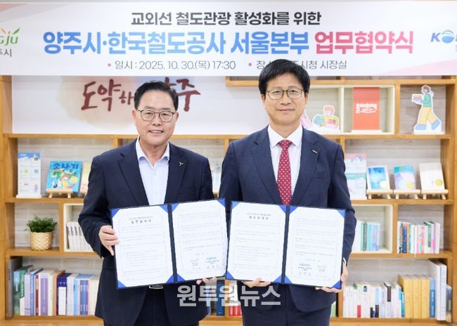 (원투원뉴스) 양주시가 지난 30일 시청 2층 집무실에서 ‘한국철도공사 서울본부’와 함께 ‘교외선 철도관광 활성화를 위한 업무협약’을 체결했다.