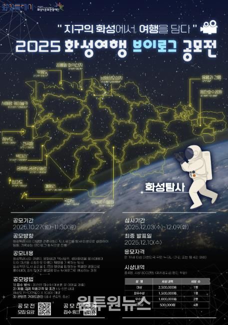 (원투원뉴스) 화성시문화관광재단은 화성특례시의 관광지, 문화공간, 역사유적, 생태자원 등을 주제로 시민이 직접 참여하는 '2025 화성여행 브이로그 공모전'을 개최하고, 10월 30일까지 공모 접수를 진행한다.