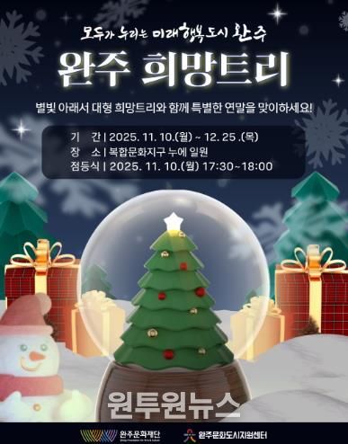 이번 대형 희망 트리는 오는 11월 10일부터 12월 25일까지 46일간 점등되며, 연말연시 동안 완주군민과 방문객들에게 따뜻한 휴식과 포토존의 즐거움을 선사할 예정이다.