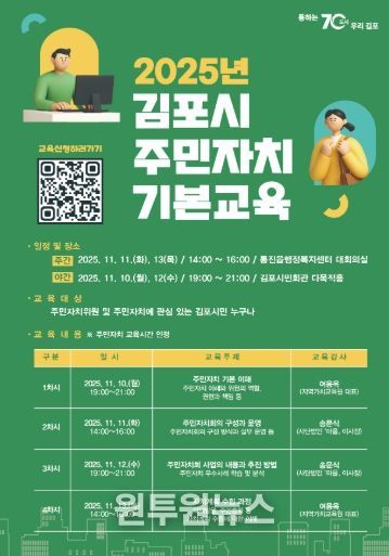 (원투원뉴스) 김포시는 주민자치위원 및 주민자치에 관심 있는 시민을 대상으로 '2025년 김포시 주민자치 기본 교육'을 오는 11월 10일부터 13일까지 운영한다고 밝혔다.