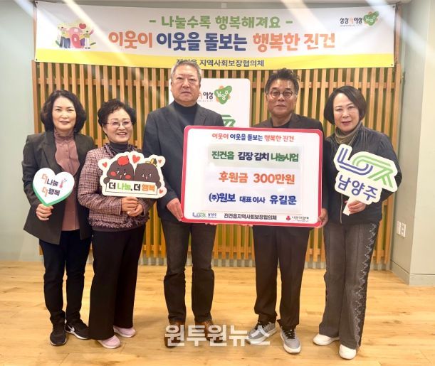 (원투원뉴스) 남양주시는 5일 진건퇴계원행정복지센터에서 주식회사 원보가 취약계층의 겨울나기 김장 지원을 위한 후원금 300만 원을 전달했다고 밝혔다.