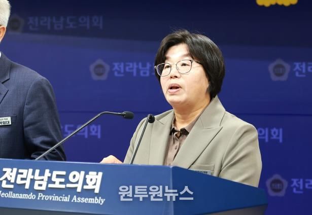 (원투원뉴스) 전라남도의회 오미화 의원(진보당·영광2)을 비롯한 진보당ㆍ정의당 소속 의원들은 지난 11월 3일, 전남도의회 브리핑룸에서 기자회견을 열고, ‘10ㆍ29 한미 관세 협상 타결’에 대한 공동 입장문을 발표했다.