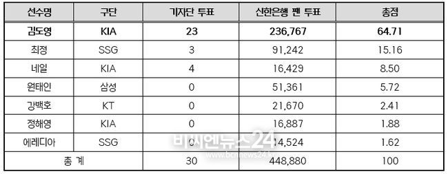 기자단 투표 총 30표 중 23표(76.7%), 팬 투표 448,880표 중 236,767표(52.7%)로 총점 64.71점을 받은 KIA 김도영은 기자단과 팬 투표에서 모두 압도적인 득표로 총점 15.16점의 2위 최정을 제치고 3~4월 월간 MVP로 선정됐다.