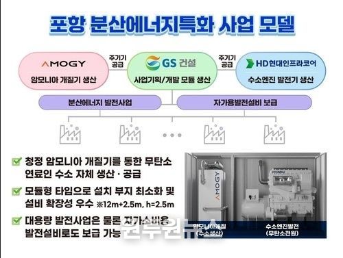 포항시가 제안한 분산에너지 특화지역 사업모델은 ‘청정 암모니아 기반 무탄소 분산에너지 실증사업’이다. 이 사업은 그린·블루 암모니아 등 청정연료를 개질해 수소를 생산하고, 수소엔진발전기를 통해 전력을 생산하는 방식으로 화석연료를 전혀 사용하지 않는 ‘완전한 무탄소 발전모델’이라는 점이 핵심이다.