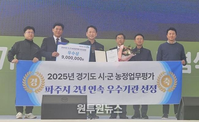 (원투원뉴스) 파주시는 지난 7일 수원시 국립농업박물관에서 열린 ‘제30회 경기도 농업인의 날 기념식’에서 녩년 경기도 시군 농정업무평가’2년 연속 우수기관으로 선정됐다고 밝혔다.