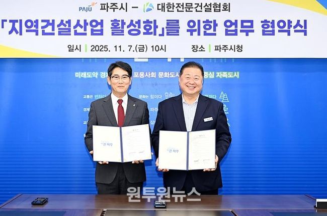 (원투원뉴스) 파주시와 대한전문건설협회 경기도회 파주시운영위원회는 지역 건설산업 활성화를 위한 상생 업무협약을 체결하고, 관내 건설 경기 부양을 위해 적극 협력하기로 뜻을 모았다.