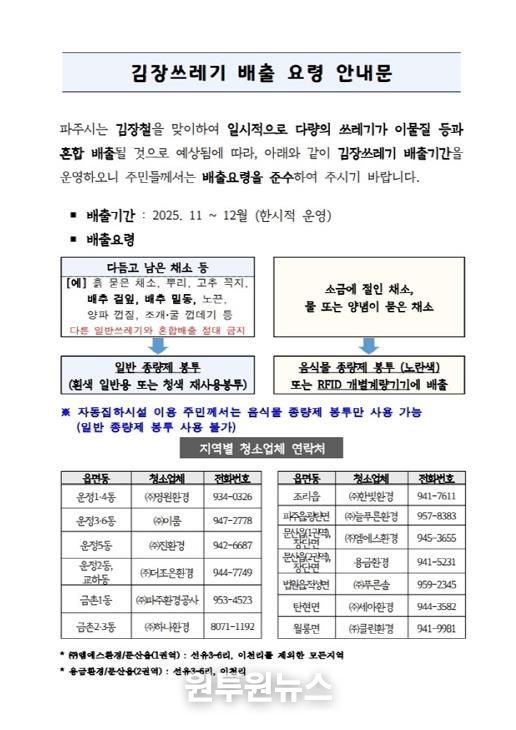 (원투원뉴스) 파주시는 동절기 김장철을 맞아 김장 쓰레기의 원활한 배출과 처리를 위해 11월부터 12월까지 ‘김장 쓰레기 특별 수거 기간’을 운영한다고 밝혔다.