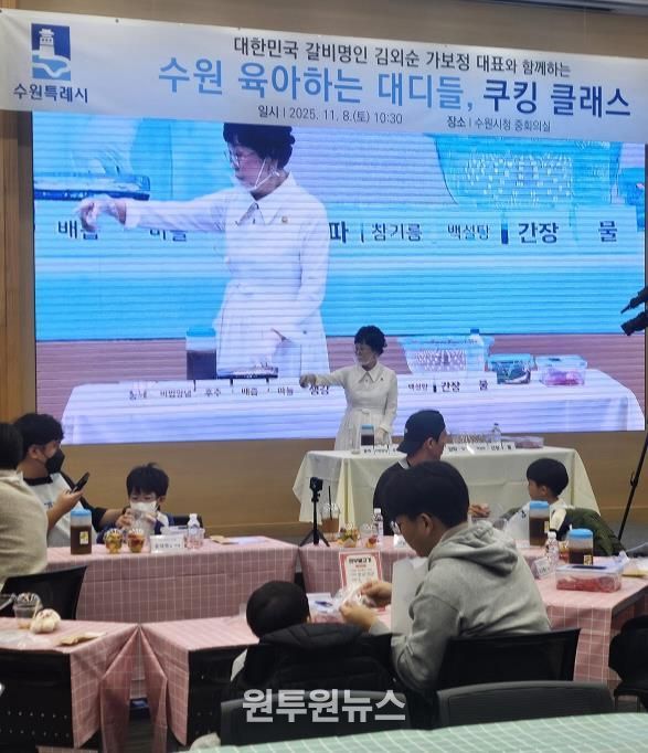 (원투원뉴스) 수원특례시는 8일 시청 중회의실에서 ‘수원 육아하는 대디들(수육대)’ 다섯 번째 오프라인 활동인 ‘쿠킹클래스 with 가보정’을 열었다. 이번 체험에는 수육대 참여 아빠와 자녀 50가족, 120여 명이 함께했다.