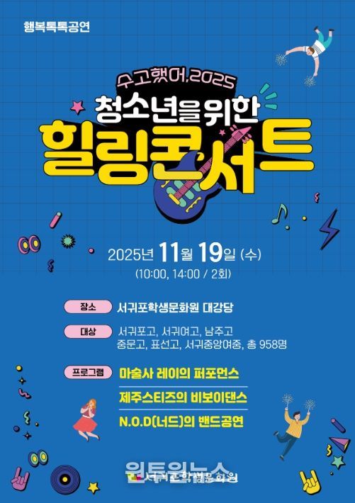 (원투원뉴스) 제주도교육청 서귀포학생문화원은 19일 서귀포학생문화원 대강당에서 행복톡톡 공연 ‘수고했어 2025, 청소년을 위한 힐링콘서트’를 오전 10시와 오후 2시 두 차례에 걸쳐 개최한다.