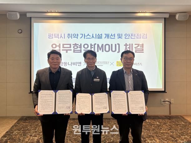 (원투원뉴스) 평택시사회복지협의회 평택행복나눔본부는 지난 5일 한국가스안전공사 경기광역본부, ㈜경동나비엔과 함께 ‘평택시 취약 가스시설 개선 및 안전점검’3자 업무협약을 체결했다.
