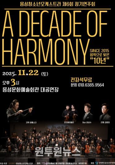 (원투원뉴스) 충청북도음성교육지원청의 방과후학교 민간공모사업 운영 단체인 음성청소년오케스트라(지휘 장에스더)가 창단 10주년을 맞이하여 오는 11월 22일 오후 3시, 음성문화예술회관 대공연장에서 제6회 정기연주회 ‘A DECADE OF HARMONY’를 개최한다.