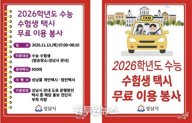개인택시와 법인택시 총 950여 대가 오전 7시부터 8시까지 ‘2026학년도 수능 수험생 택시 무료 이용 봉사’ 표지를 부착하고, 수험생을 대상으로 시험장까지 무료 운행 서비스를 제공한다. 수험생은 성남콜택시(031-755-4000)를 통해 택시를 호출하면 시험장까지 무료로 이동할 수 있다.