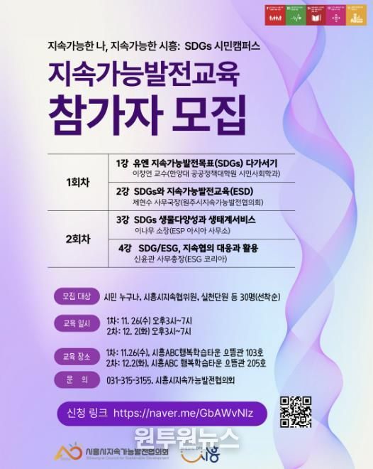 (원투원뉴스) 시흥시지속가능발전협의회는 오는 11월 26일과 12월 2일 시흥ABC행복학습타운에서 양일간 ‘지속가능한 나, 지속가능한 시흥 SDGs 시민캠퍼스’를 개최한다.