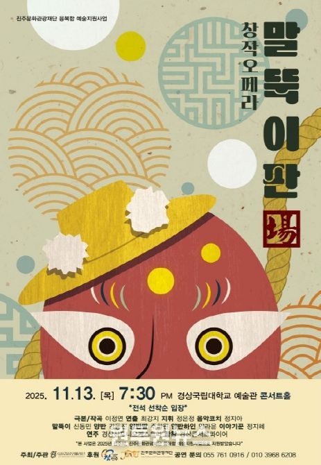 (원투원뉴스) 경상국립대학교 음악교육과 최강지 교수가 이끄는 경상오페라단은 진주의 대표 민속예술 ‘진주 오광대’를 모티브로 한 창작오페라 '말뚝이판場'(작사·작곡 이정연)을 11월 13일 오후 7시 30분 경상국립대학교 음악교육과 콘서트홀에서 초연한다.