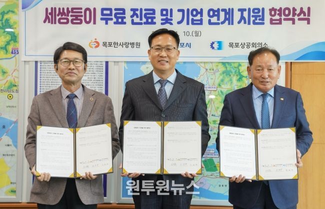 (원투원뉴스) 목포시는 지난 11월 10일 목포한사랑병원, 목포상공회의소와 함께 세쌍둥이를 출산해 다섯 자녀를 양육 중인 가정을 지원하기 위한 ‘세쌍둥이 지원 협약’을 체결했다.