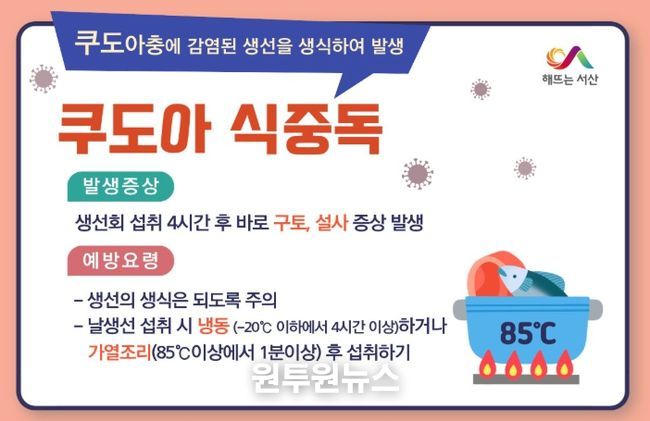 (원투원뉴스) 충남 서산시가 동절기 생선회 소비가 늘어나는 시기를 맞아, 어류 기생충인‘쿠도아충’감염으로 인한 식중독 발생에 주의할 것을 시민들에게 당부했다.