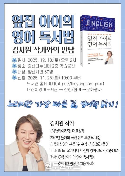 (원투원뉴스) 양산시립 어린이영어도서관은 오는 12월 13일 오후 2시 『옆집 아이의 영어 독서법』의 저자 김지원 작가를 초청하여 작가와의 만남을 운영한다.