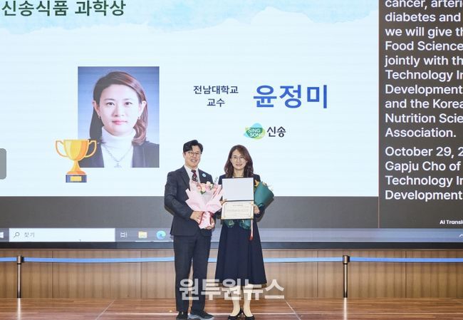 (원투원뉴스) 전남대학교 생활과학대학 식품영양과학부 윤정미 교수는 지난 10월 29일부터 31일까지 부산 벡스코(BEXCO)에서 개최된 한국식품영양과학회 2025 국제심포지엄 및 정기학술대회에서 ‘신송 식품과학상’을 수상(상금 1000만원)했다고 밝혔다.