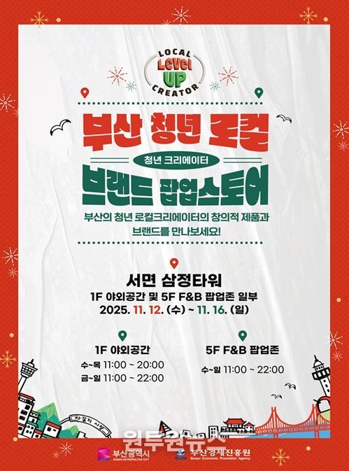 (원투원뉴스) 부산시와 부산경제진흥원은 오늘(12일)부터 16일까지 5일간 서면 삼정타워에서 '2025 부산 청년 로컬 브랜드 팝업스토어'를 개최한다고 밝혔다.