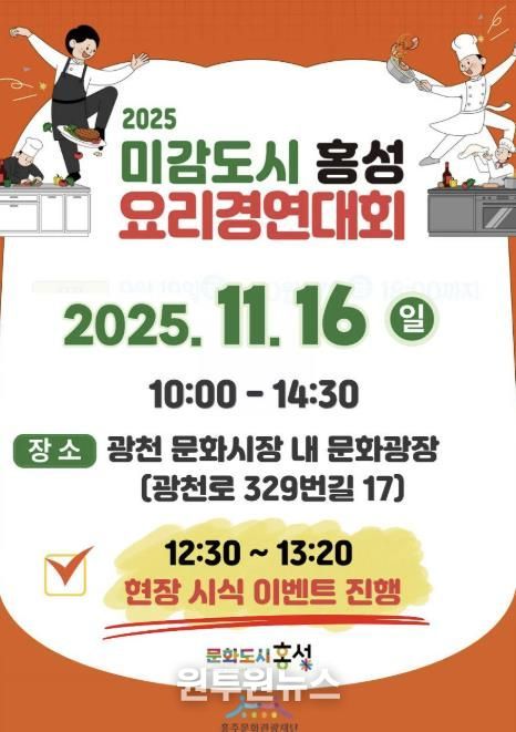 (원투원뉴스) 홍성군은 오는 16일 광천 문화시장 내 문화광장에서 ‘2025년 미감도시 홍성 요리경연대회’를 개최한다고 밝혔다.