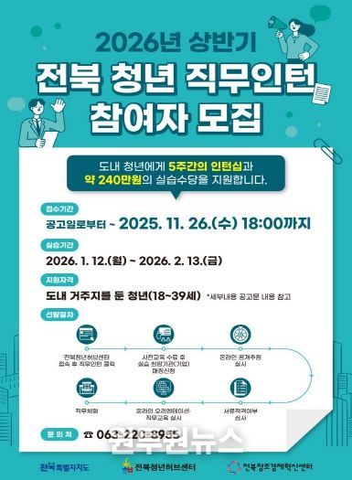 (원투원뉴스) 전북특별자치도와 전북창조경제혁신센터가 ‘2026년 상반기 전북 청년 직무인턴’ 참여자를 11월 26일까지 모집한다.
