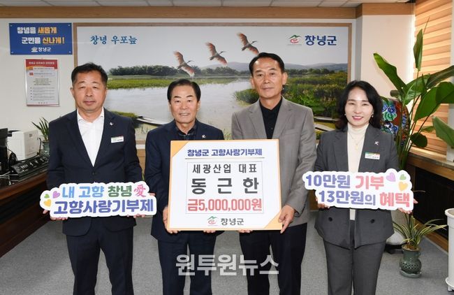 (원투원뉴스) 창녕군(군수 성낙인)은 세광산업 동근한 대표가 지난 11일 고향사랑기부제에 500만 원을 기탁했다고 밝혔다.
