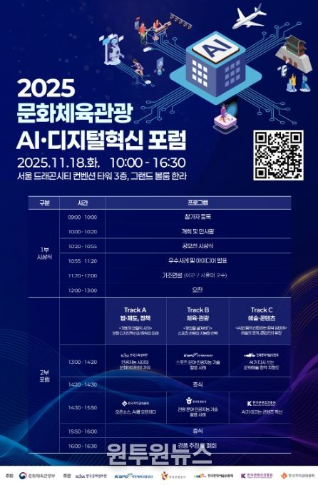 (원투원뉴스) 문화체육관광부는 문화·체육·관광 분야 전문기관들과 공동으로 11월 18일, 서울드래곤시티(서울 용산구)에서 ‘2025 문화체육관광 인공지능(AI)·디지털혁신 포럼’을 개최한다.