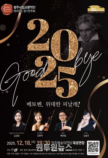 (원투원뉴스) 청주시립교향악단은 오는 12월 18일 오후 7시 30분 청주예술의전당 대공연장에서 제199회 정기연주회 ‘Good bye 2025 – 베토벤, 위대한 피날레!’ 공연을 개최한다.
