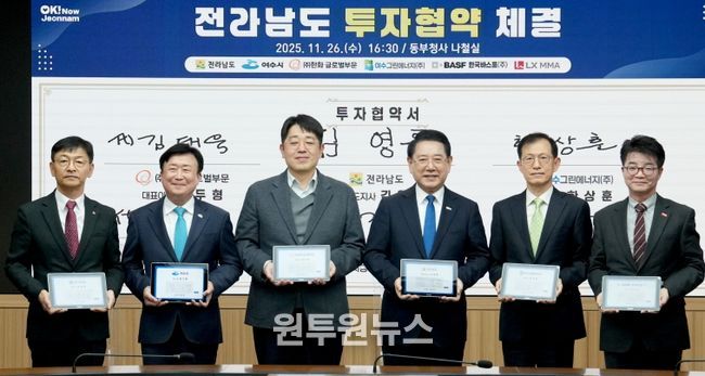 (원투원뉴스) 전라남도는 26일 동부청사에서 여수그린에너지㈜, ㈜한화 글로벌부문, ㈜LX MMA 등과 1조 2천441억 원, 고용 창출 147명 규모의 투자협약을 했다.