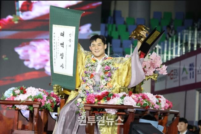 지난 5월 유성온천장사씨름대회 금강장사, 지난 10월 추석장사씨름대회 태백장사에 이어 올 시즌 3관왕을 달성하며 개인 통산 25번째(태백 21회·금강 4회) 장사 타이틀을 획득했다.