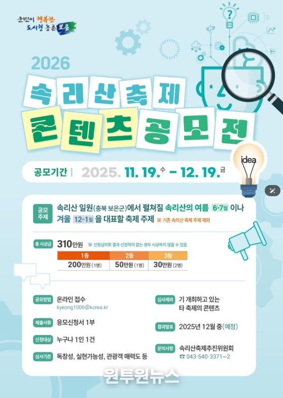 (원투원뉴스) 충북 보은군은 ‘2026 속리산축제’에 반영할 새로운 축제 콘텐츠를 발굴하기 위해 전국 단위 콘텐츠 공모전을 개최한다고 28일 밝혔다.