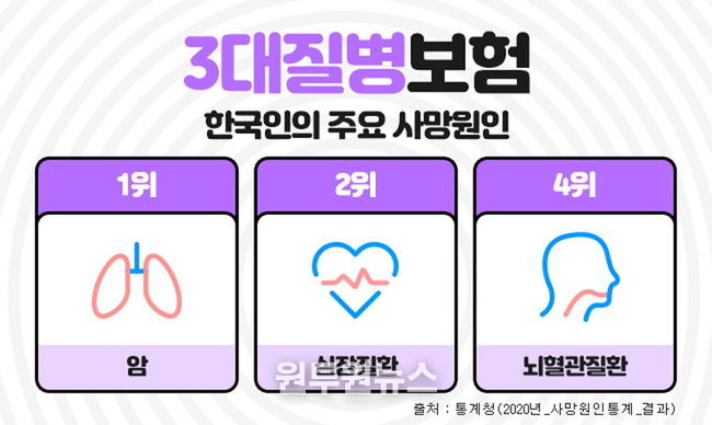 (원투원뉴스) 한국인의 주요 사망원인중에 암, 뇌혈관질환, 심혈관질환은 흔히 3대질병이라 일컬어지며 살아가면서 가장 먼저 대비해야 하는 중대질병으로 항상 강조되고 있다. 이들 질병에 미리 대비하기 위해 가입하는 것이 진단비보험인데, 이러한 3대질병진단비를 중점으로 보장하는 보장성보험이 3대진단비보험 이다. 3대질병진단비보험은 각각의 질병에 주목해서 보장하기도 하지만, 나에게 맞는 추가 특약을 잘 골라서 가입한다면 종합건강보험으로도 충분히 활용도가 높다.