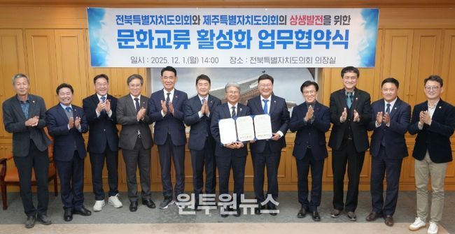 (원투원뉴스) 전북특별자치도의회와 제주특별자치도의회는 문화·관광·세계유산 분야 협력을 강화하기 위해 1일 전북도의회 의장실에서 문화교류 활성화 업무협약(MOU)을 체결했다.