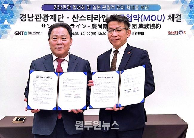 (원투원뉴스) 경남관광재단은 12월 2일 창원컨벤션센터에서 팬스타그룹 일본 현지법인인 ‘산스타라인(SANSTAR LINE)’과 ‘경남 관광 활성화 및 일본 관광객 유치 확대’를 위한 업무협약(MOU)을 체결했다고 밝혔다.